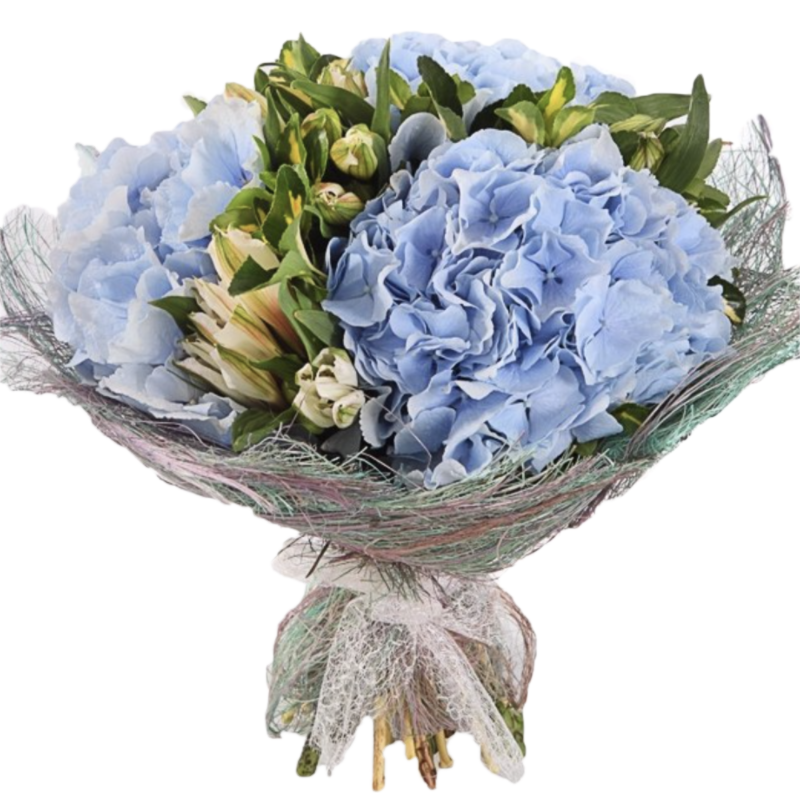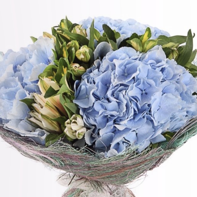 Букет состоит из 3 гортензии, 5 веток альстромерии, красивая упаковка, атласная лента.