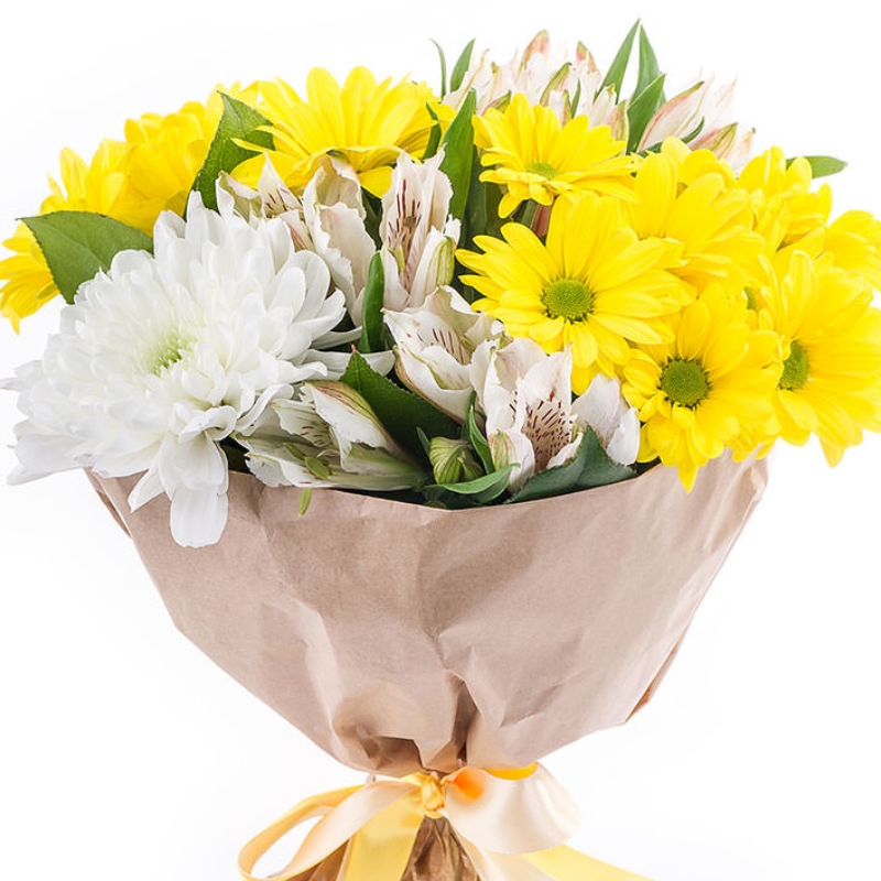 Букет состоит из 2 ветки желтых хризантем, 2 альстромерии, 1 белая хризантема, крафт, атласная лента.