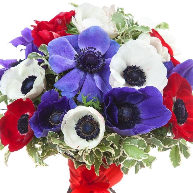 Букет состоит из MIX из 21 анемона, зелень, прозрачная упаковка, атласная лента.