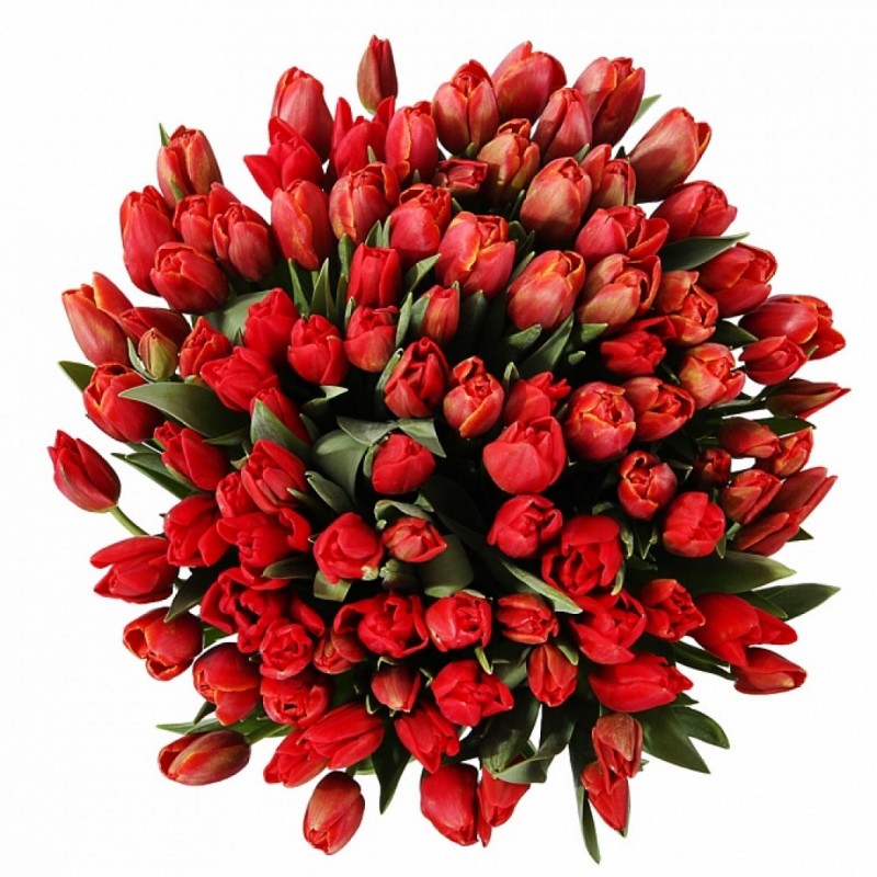Букет состоит из 101 красный тюльпан, прозрачная упаковка, красная лента.