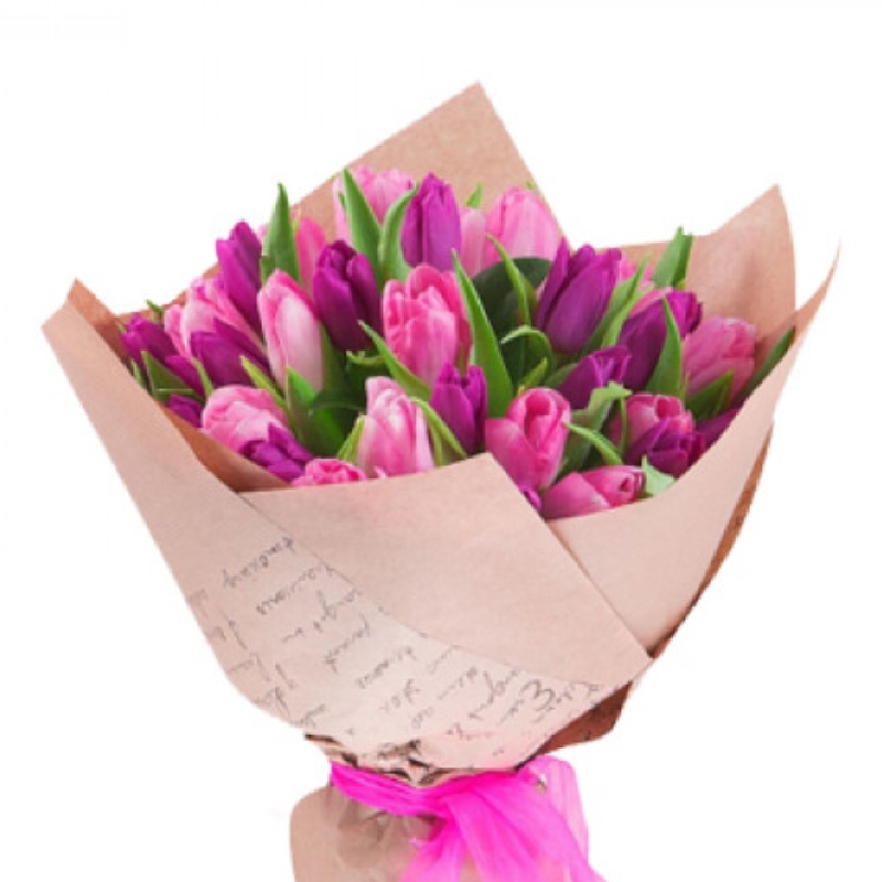 Букет состоит из 13 сиреневых тюльпанов, 12 розовых тюльпанов, крафт, атласная лента.