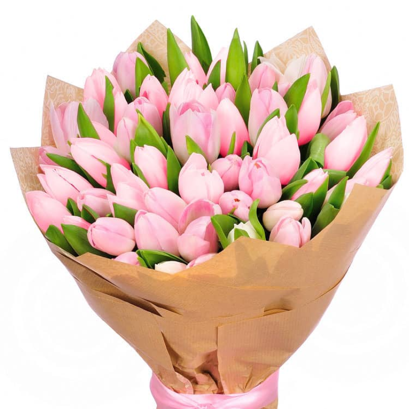 Букет состоит из 13 белых тюльпанов, 12 розовых тюльпанов, крафт, лента.