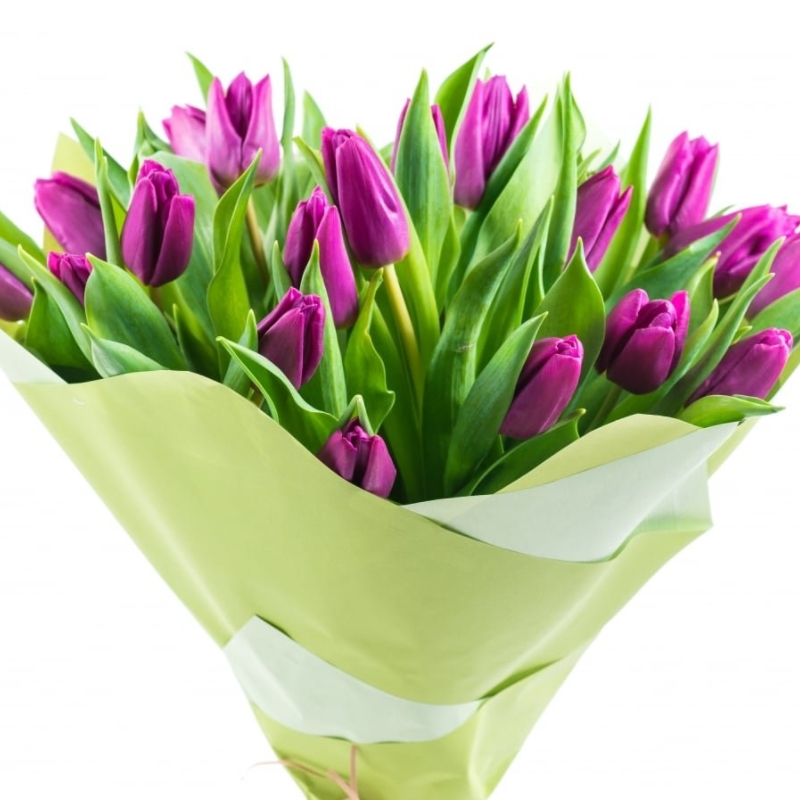 Букет состоит из 25 сиреневых тюльпанов, красивая упаковка, атласная лента.