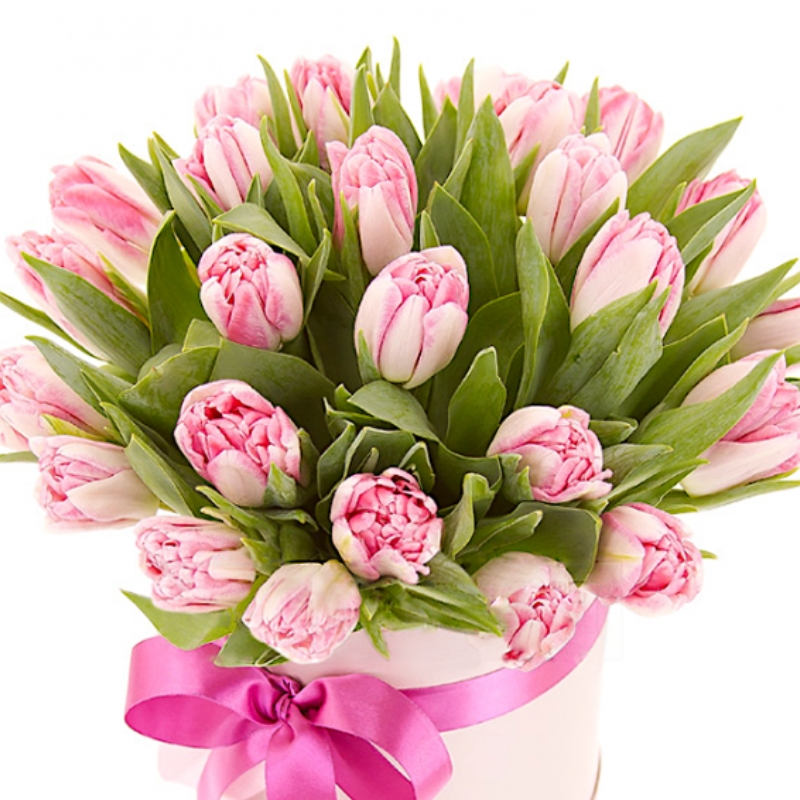 Букет состоит из 25 розовых тюльпанов, коробка, атласная лента, оазис.