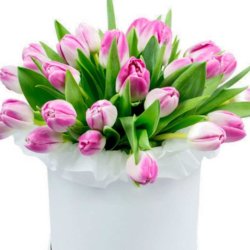 Букет состоит из 25 розовых тюльпанов, коробка, оазис.