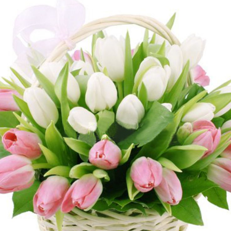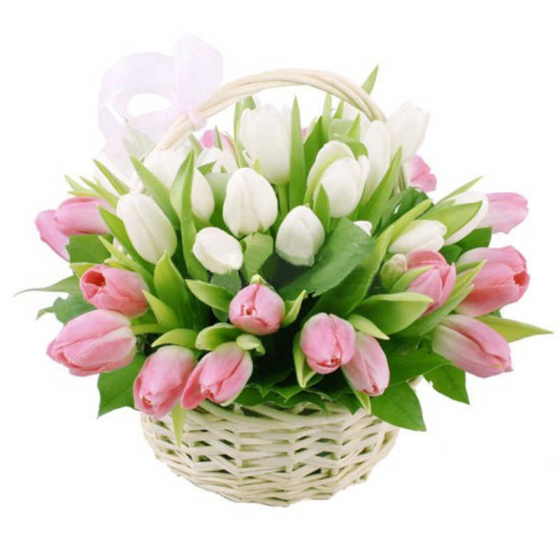 26 розовых тюльпанов, 25 белых тюльпанов, корзина, атласная лента.