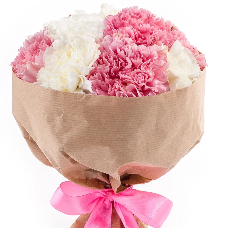 Букет состоит из 8 белых гвоздик, 7 розовых гвоздик, крафт, атласная лента.