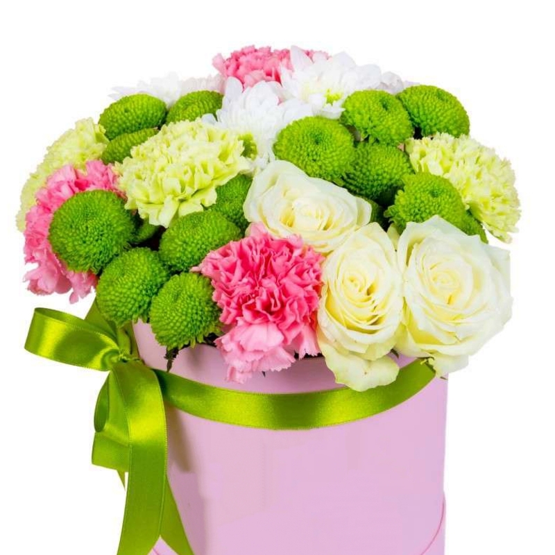 Букет состоит из 6 гвоздик, 3 розы, 4 ветки кустовых хризантем, коробка, оазис, атласная лента.