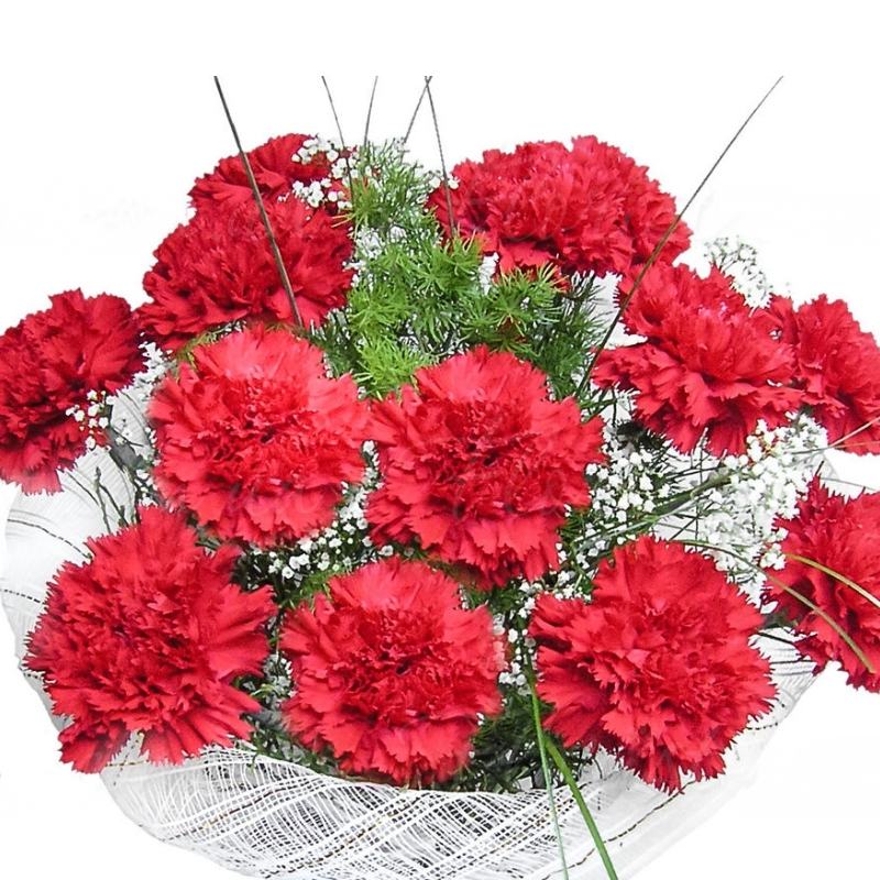 Букет состоит из 13 красных гвоздик, 3 гипсофила, зелень, красивая упаковка, зелень.