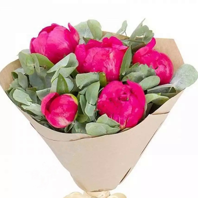 Букет состоит из 5 красных пионов, эвкалипт, крафт, атласная лента.