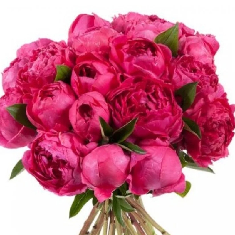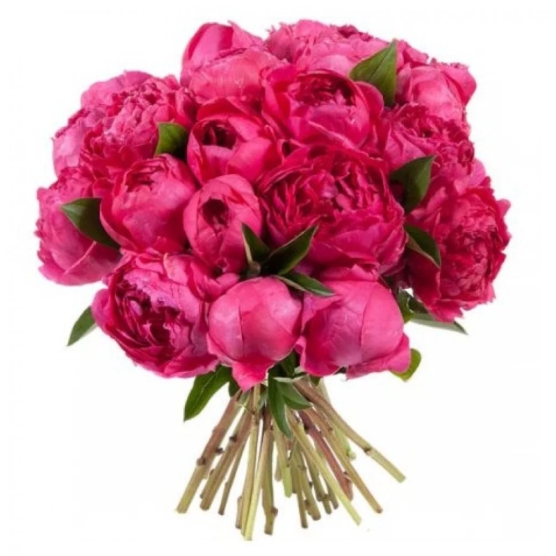 Букет состоит из 19 красных пионов, прозрачная упаковка, атласная лента.
