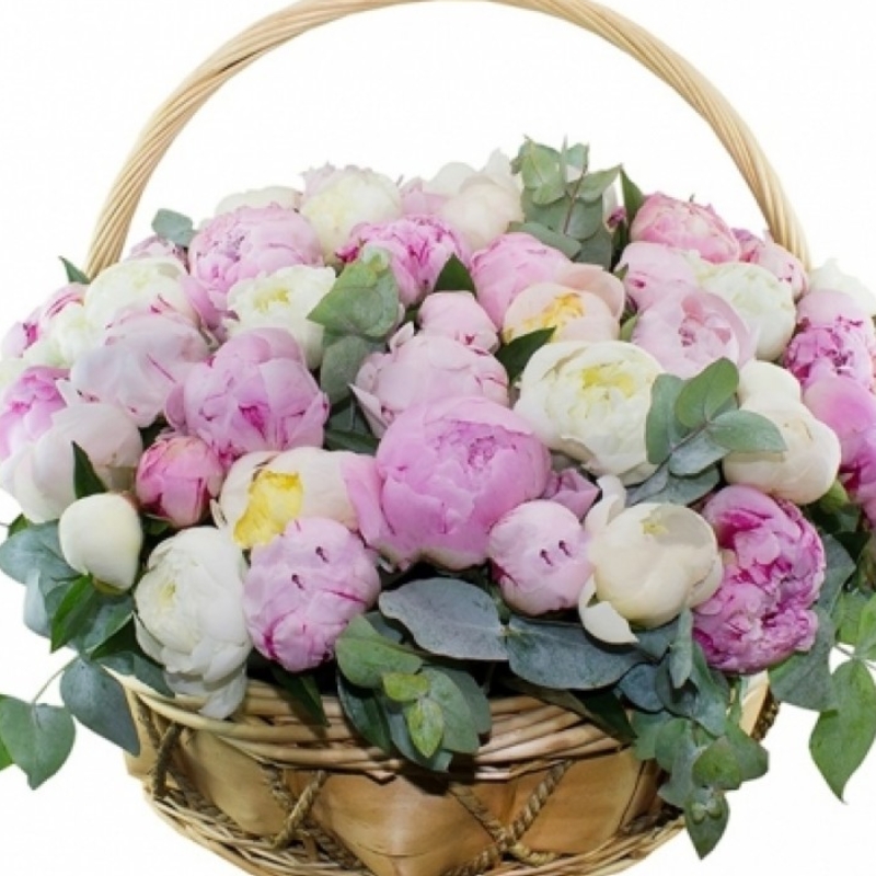 Букет состоит из 25 розовых пионов, 20 белых пионов, эвкалипт, корзина, оазис.