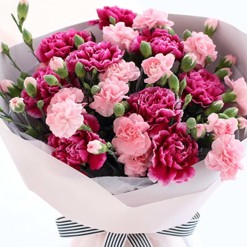 Букет состоит из 9 стеблей фиолетовой гвоздики, 10 веток розовой гвоздики, красивая упаковка, атласная лента.
