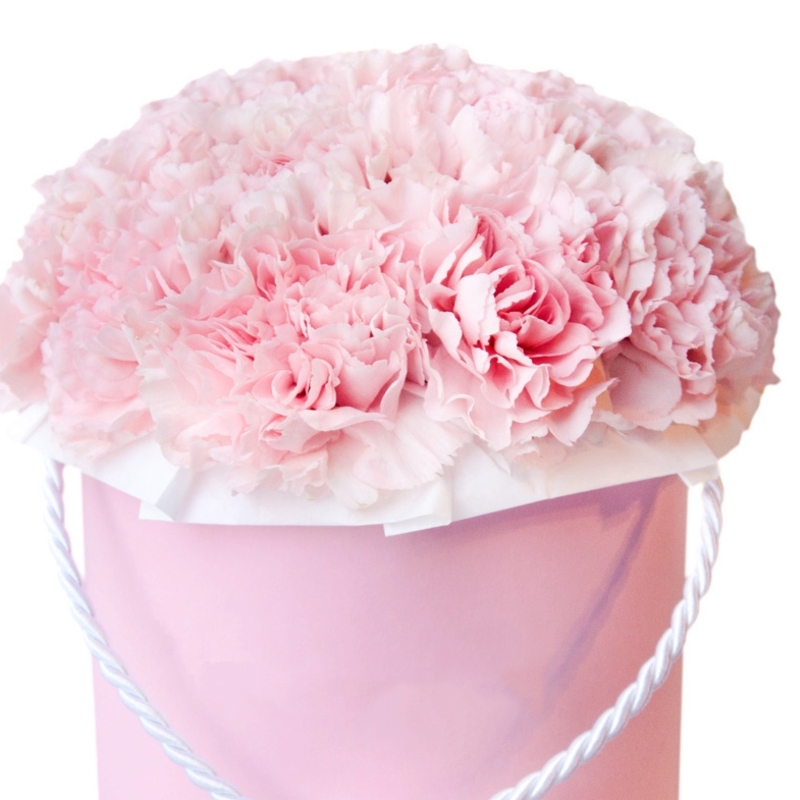 Букет состоит из 25 розовых гвоздик, коробка, оазис.