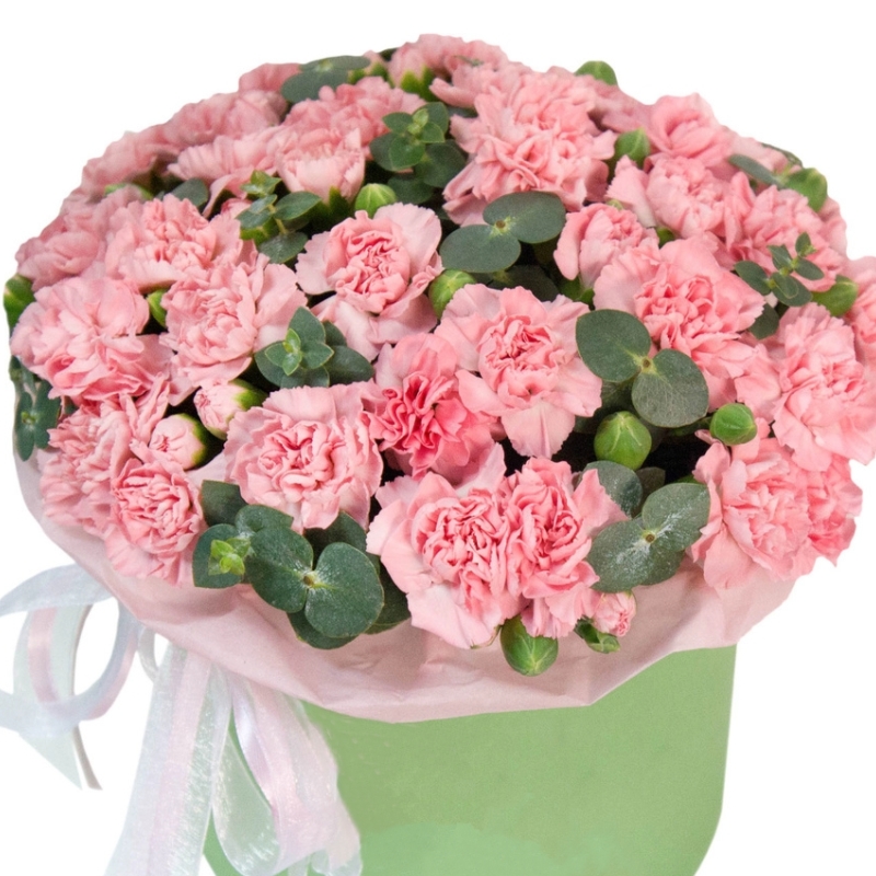 Букет состоит из 15 веток кустовых гвоздик, эвкалипт, коробка, оазис.