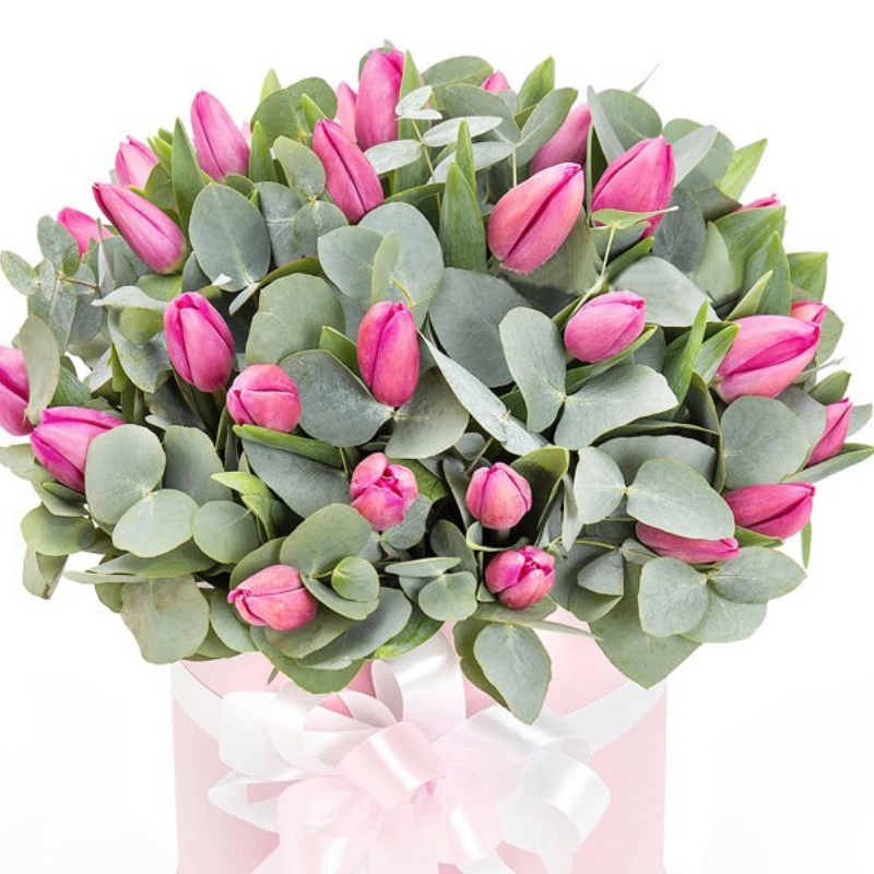 Букет состоит из 45 тюльпанов, эвкалипт, коробка, атласная лента, оазис.