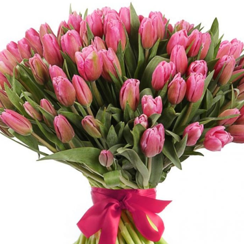 Букет состоит из 75 розовых тюльпанов, прозрачная упаковка, розовая лента.