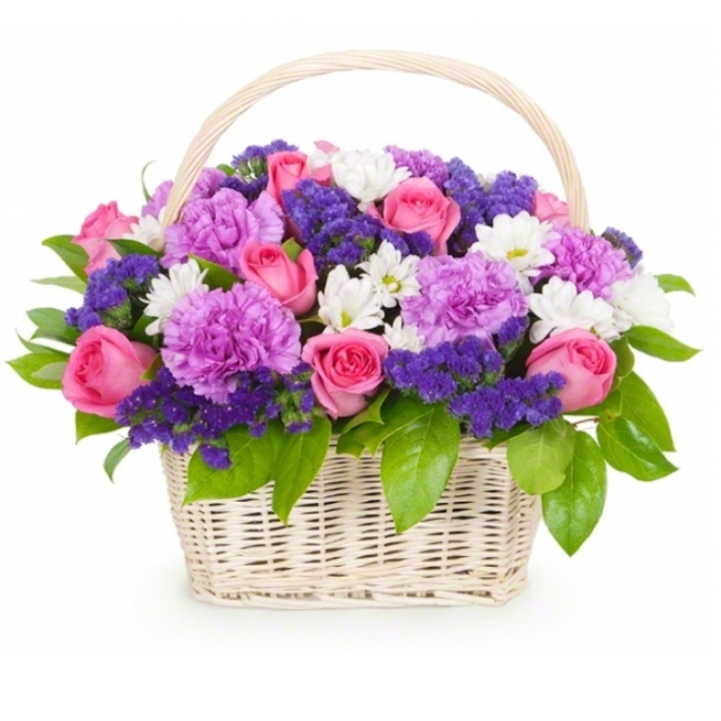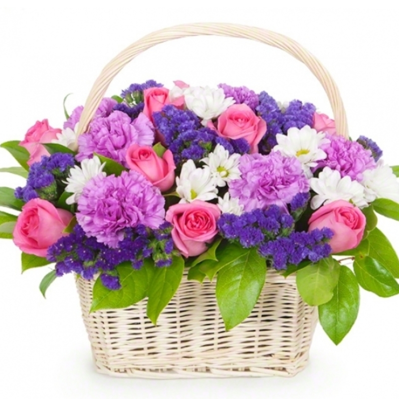 11 розовых роз, 7 фиолетовых гвоздик, 3 ветки хризантемы, 6 статица, зелень, корзина, оазис.