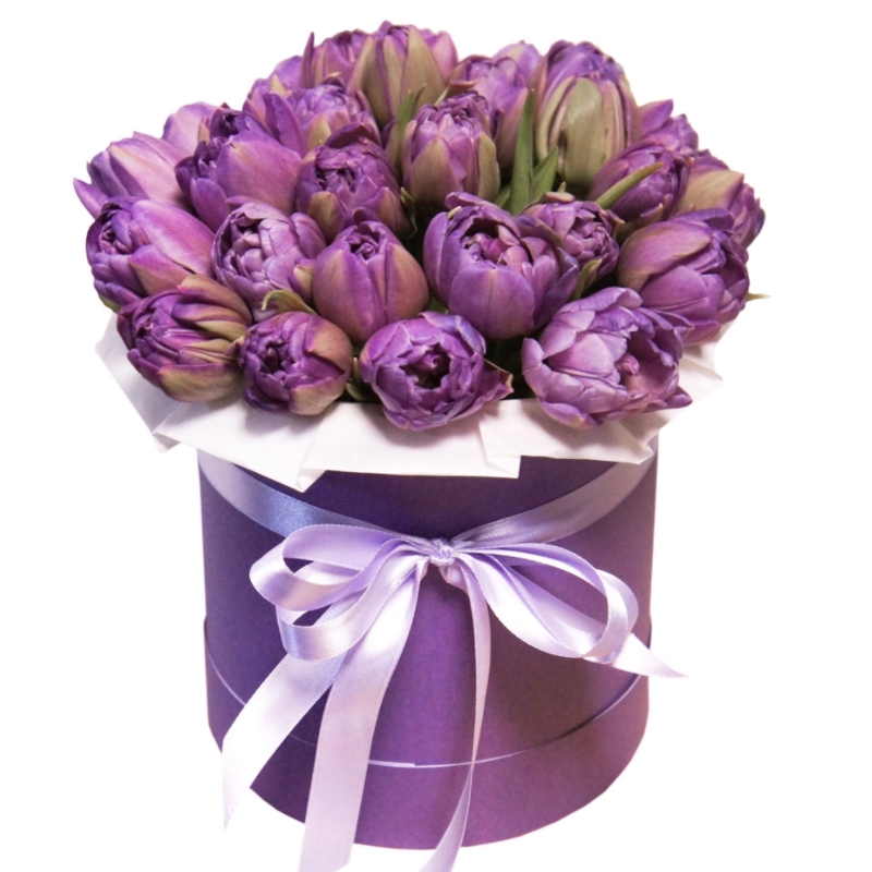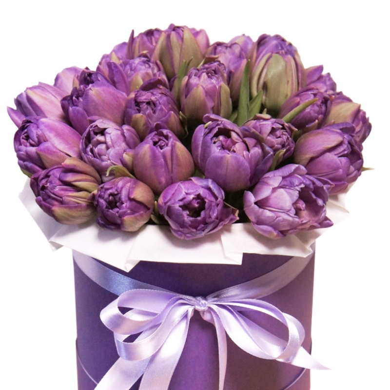 Букет состоит из 27 сиреневых пионовидных тюльпанов, коробка, атласная лента, оазис.