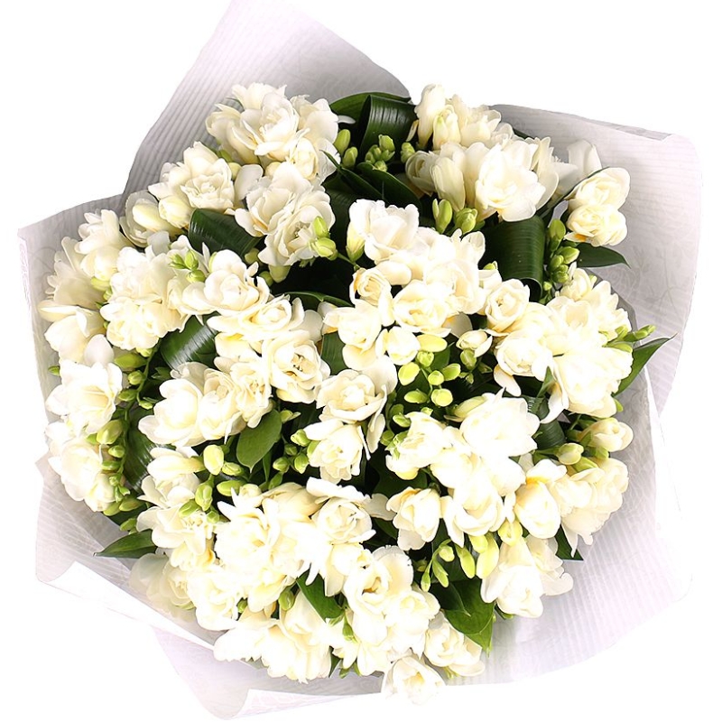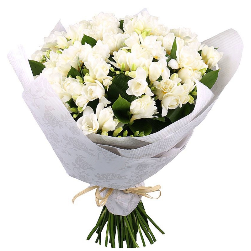 Букет состоит из 35 белых фрезий, зелень, крафт, атласная лента.