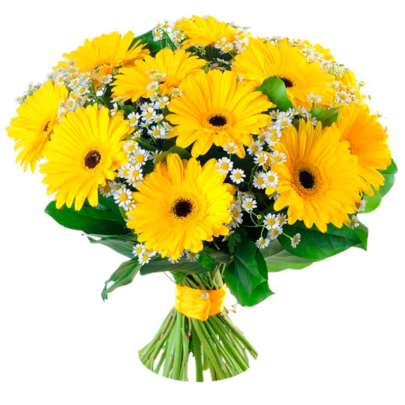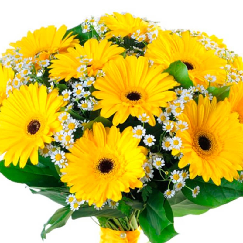 Букет состоит из 13 гербер, 10 танацетум, салал, прозрачная упаковка, атласная лента.