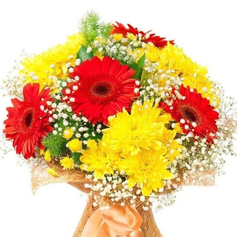 Букет состоит из 5 красных гербер, 4 ветки желтой хризантемы, 3 гипсофила, зелень, красивая упаковка, атласная лента.