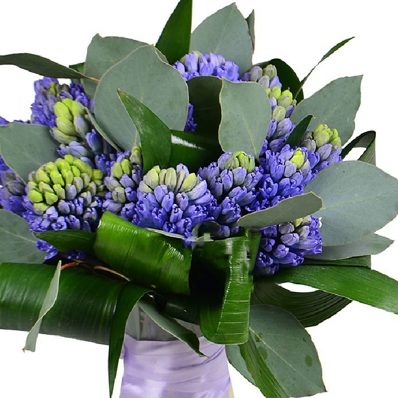 Букет состоит из 19 гиацинтов, аспидистра, эвкалипт, прозрачная упаковка, атласная лента.