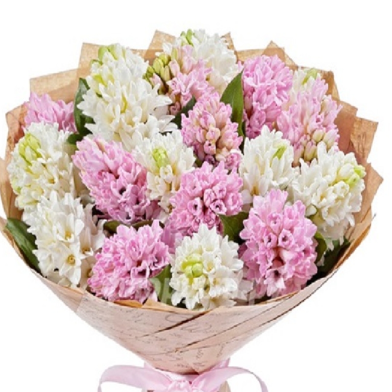 Букет состоит из MIX из 19 гиацинтов, крафт, атласная лента.