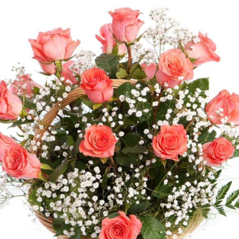 19 розовых роз, 5 гипсофила, зелень, корзина.