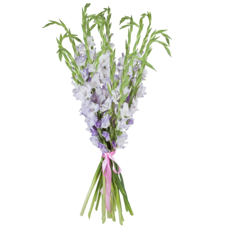 Букет состоит из 15 голубых гладиолусов, прозрачная упаковка, атласная лента.