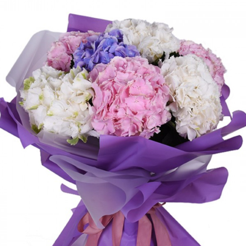 Букет состоит из 7 разноцветных гортензий, красивая упаковка, атласная лента.
