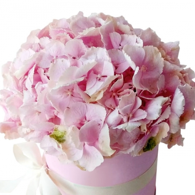Букет состоит из 3 розовые гортензии, коробка, атласная лента, оазис.