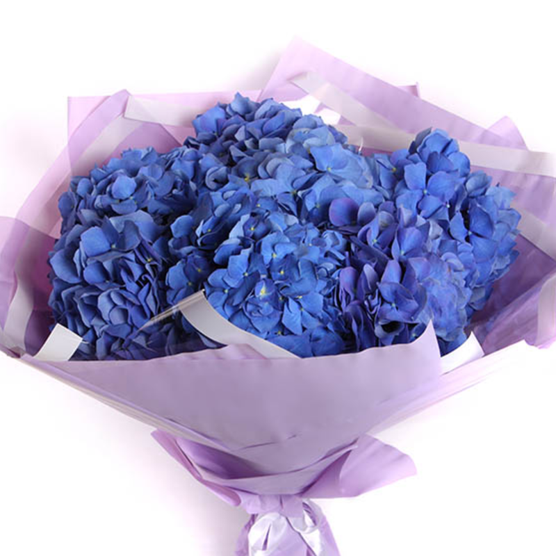 Букет состоит из 7 синих гортензий, красивая упаковка, атласная лента.