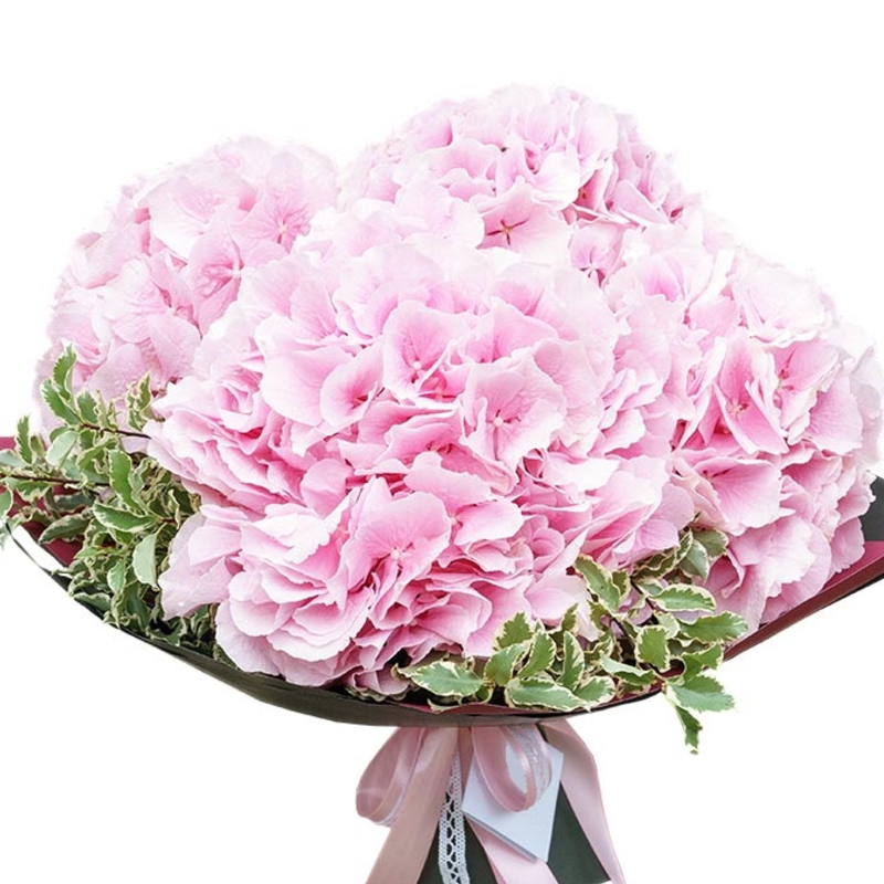 Букет состоит из 5 розовых гортензий, зелень, крафт, атласная лента.