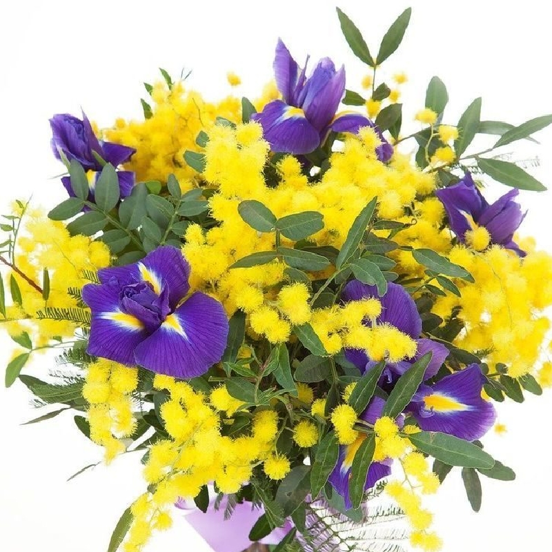 Букет состоит из 7 ирисов, 4 ветки мимозы, зелень, прозрачная упаковка, атласная лента.