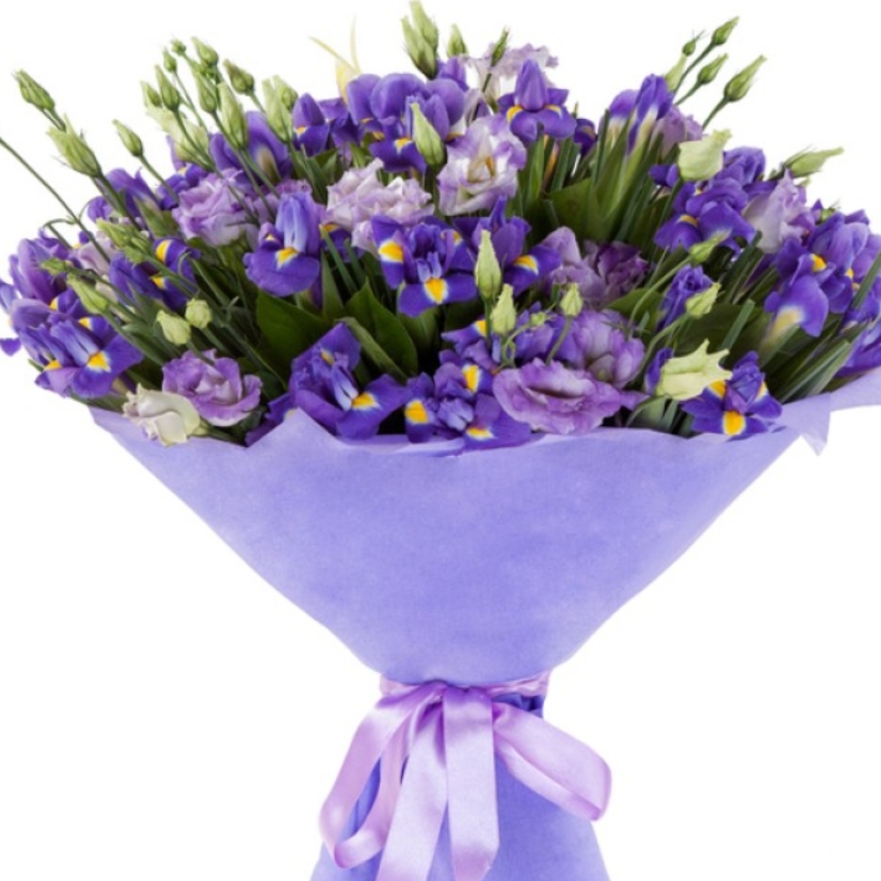 Букет состоит из 15 веток эустомы, 35 ирисов, зелень, красивая упаковка, атласная лента.
