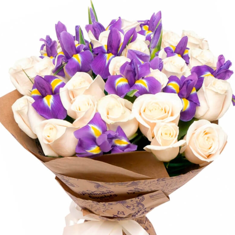 Букет состоит из 19 белых роз, 14 ирисов, крафт, атласная лента.