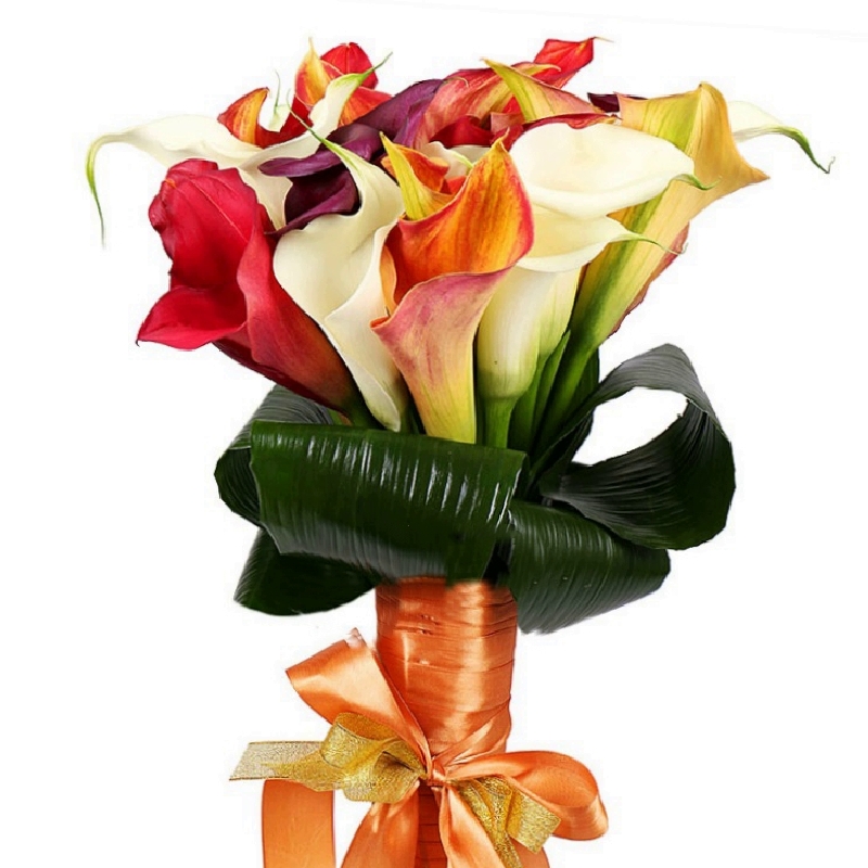 Букет состоит из MIX из 21 каллы, аспидистра, прозрачная упаковка, атласная лента.
