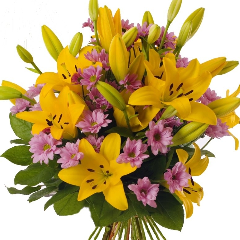 Букет состоит из 5 веток желтых лилии, 5 веток розовых хризантем, зелень, прозрачная упаковка, атласная лента.