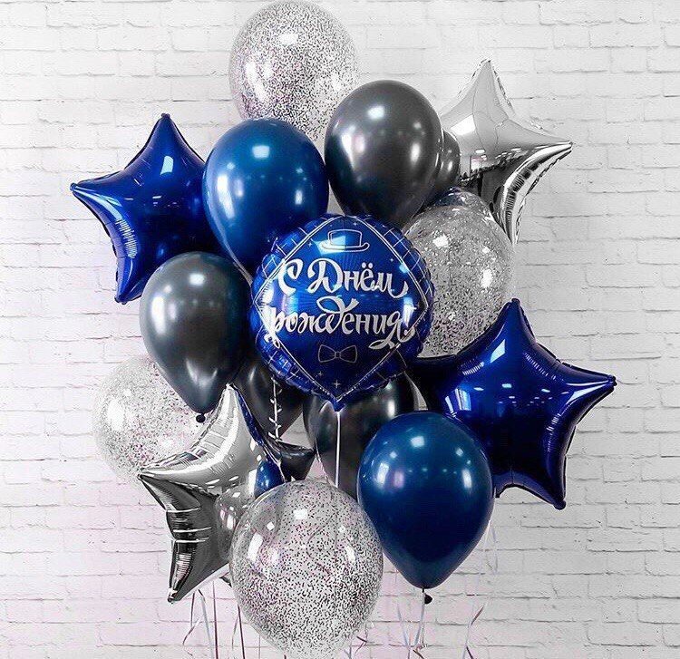В состав фонтана входят 6 латексных шаров, 4 прозрачных шаров с конфетти, 4 фольгированные звезды и круглый.