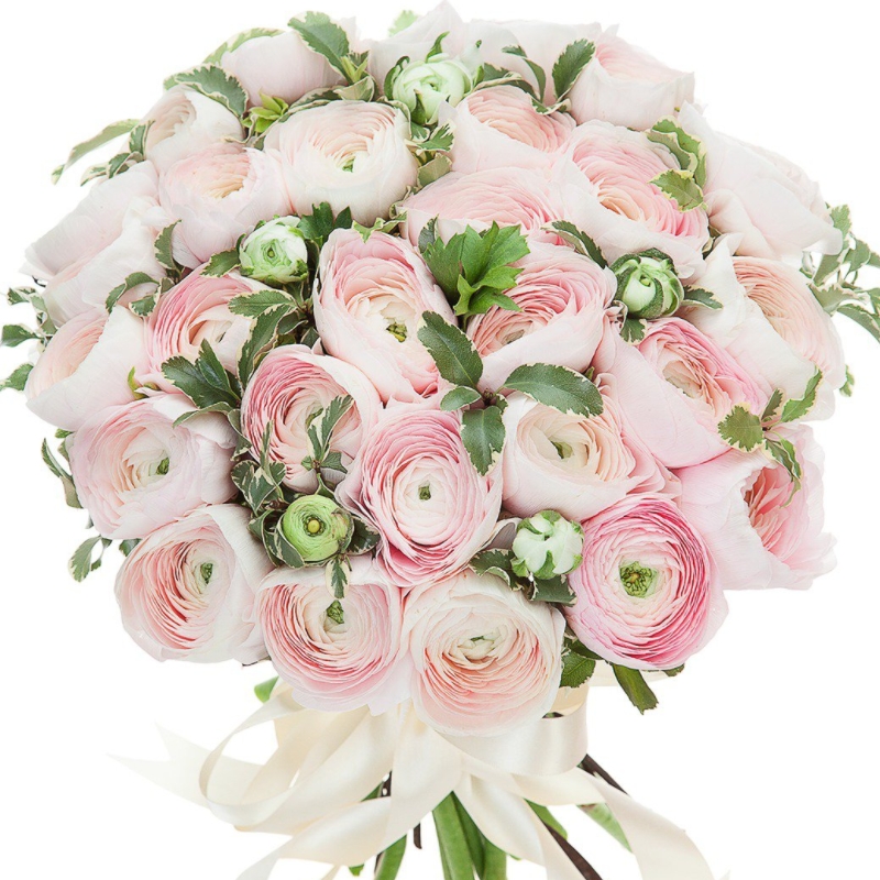 Букет состоит из 31 розовый ранункулюс, питтоспорум, прозрачная упаковка, атласная лента.