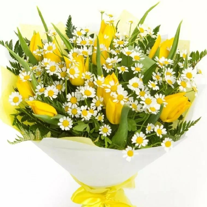 Букет состоит из 11 желтых тюльпанов, 4 ветки танацетума, зелень, красивая упаковка, атласная лента.