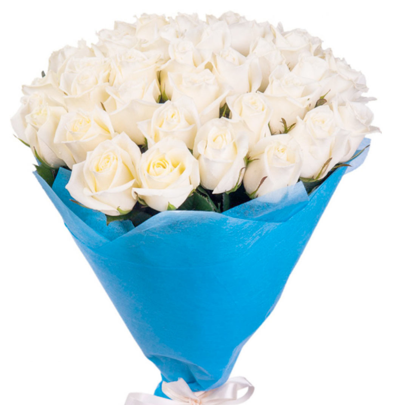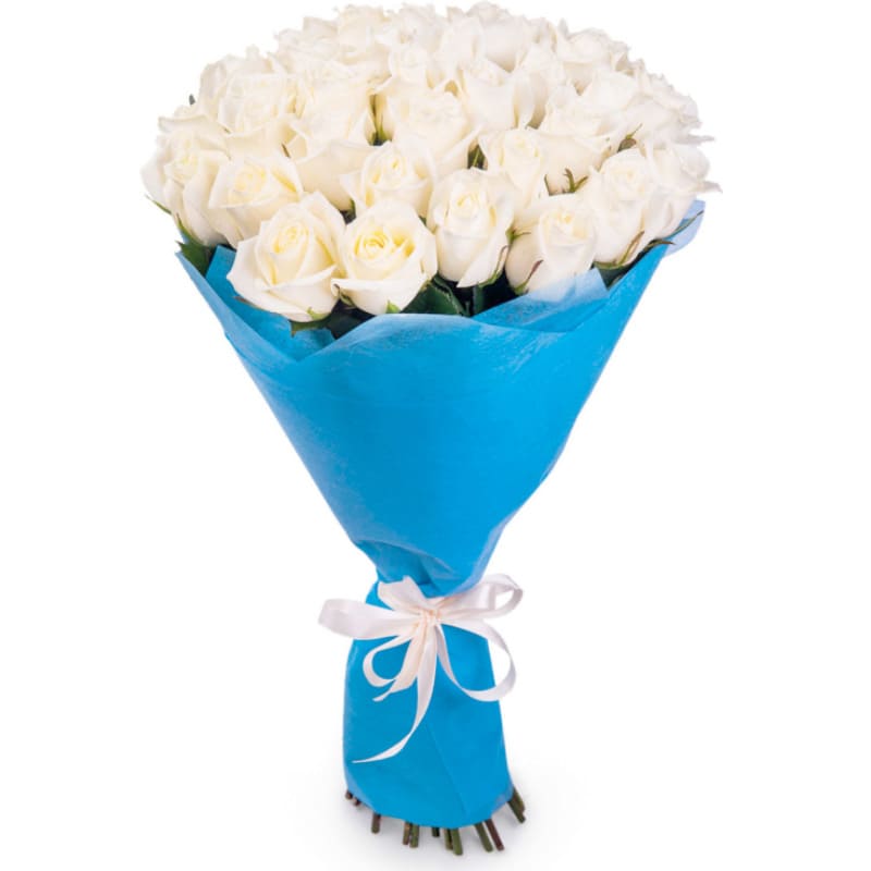 Букет состоит из 45 белых роз, красивая упаковка, атласная лента.