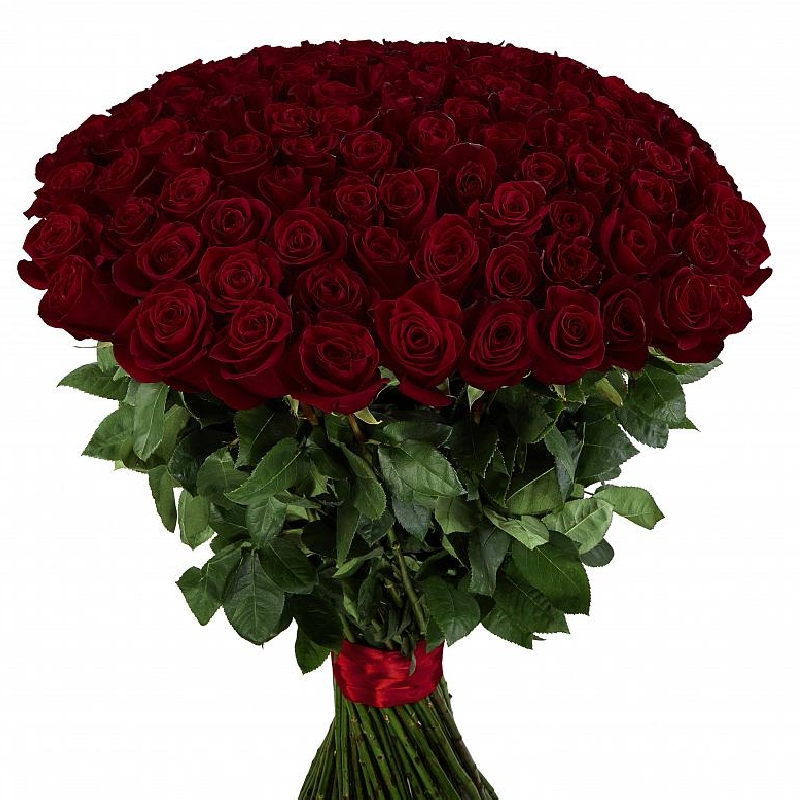 Букет состоит из 101 бордовая роза, прозрачная упаковка, атласная лента.