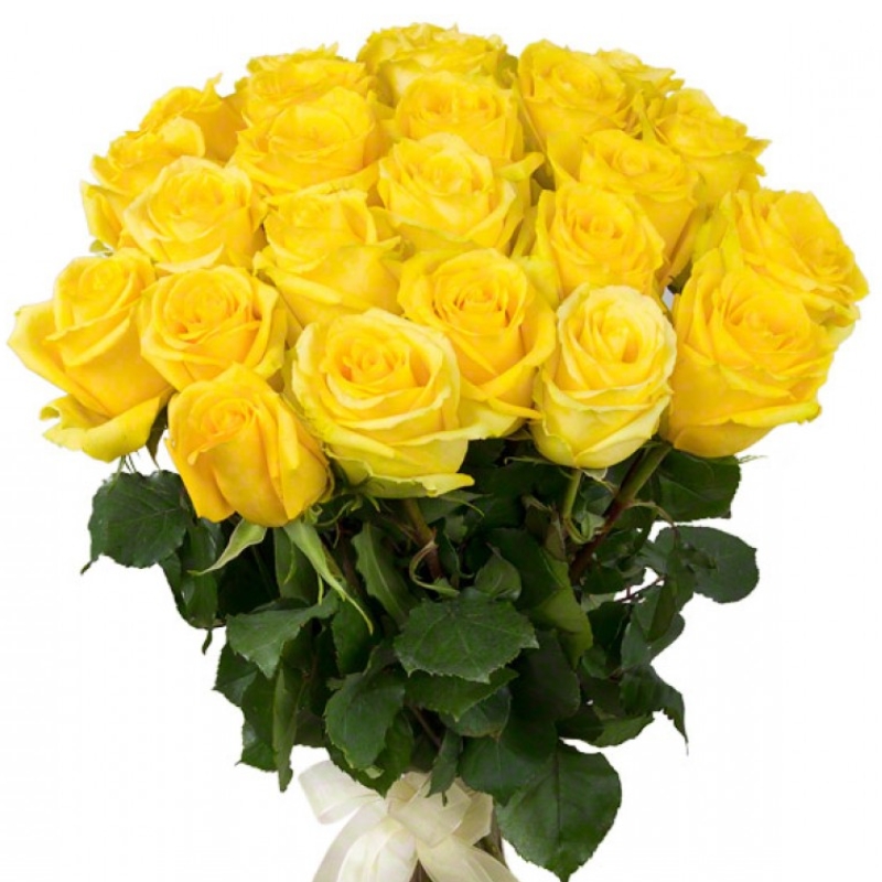 Букет состоит из 25 желтых роз, прозрачная упаковка, атласная лента.