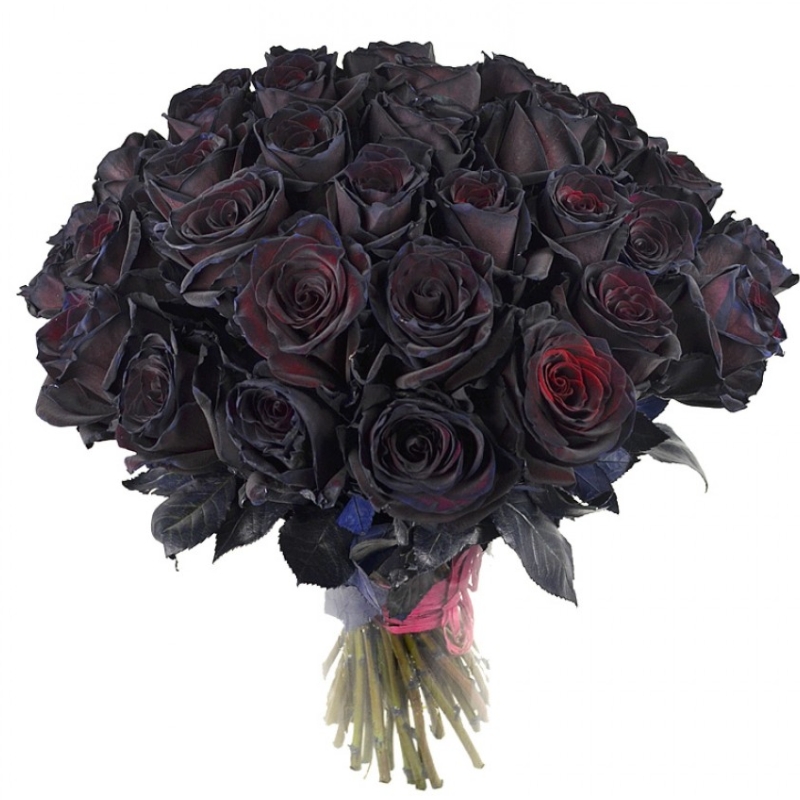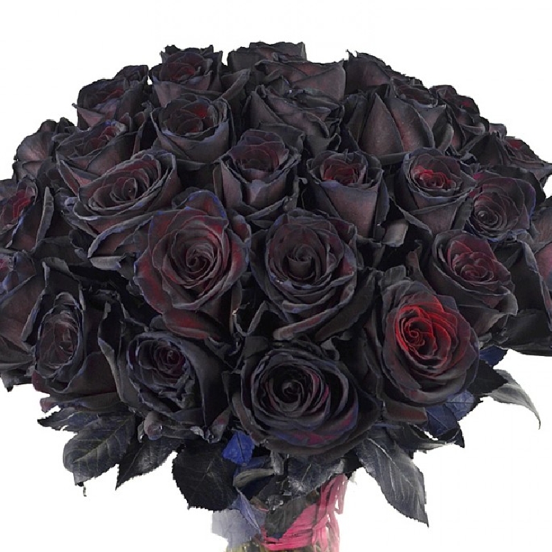 Букет состоит из 35 темно-бордовых роз, прозрачная упаковка, атласная лента.
