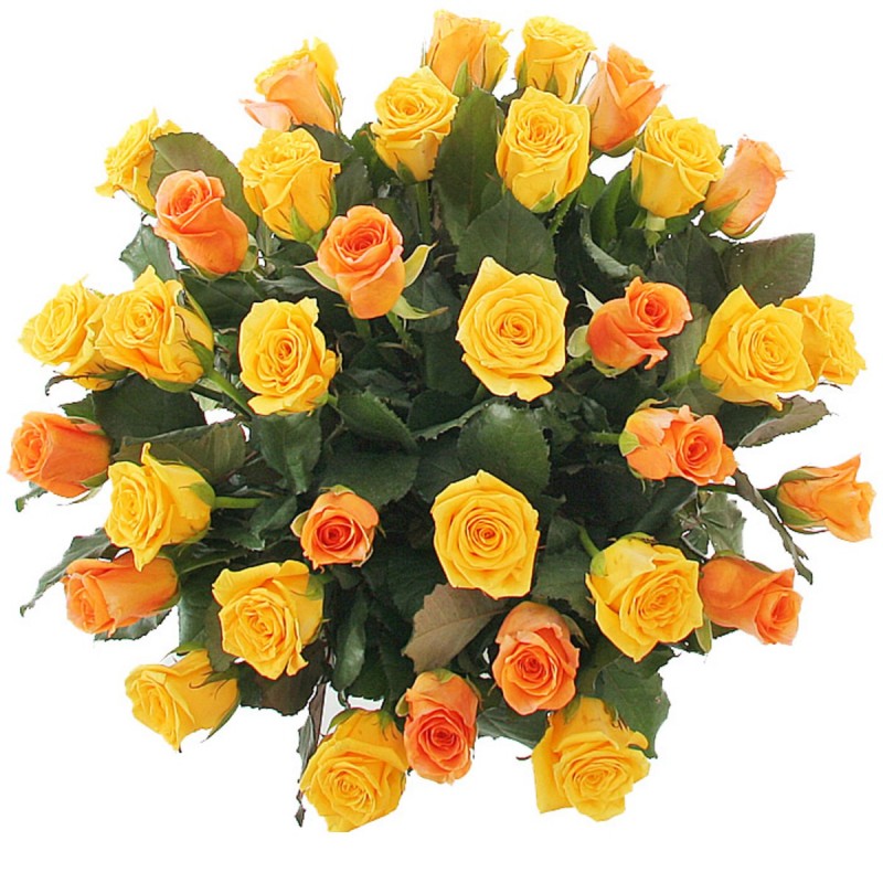 Букет состоит из 16 коралловых роз, 15 желтых роз, прозрачная упаковка, атласная лента.
