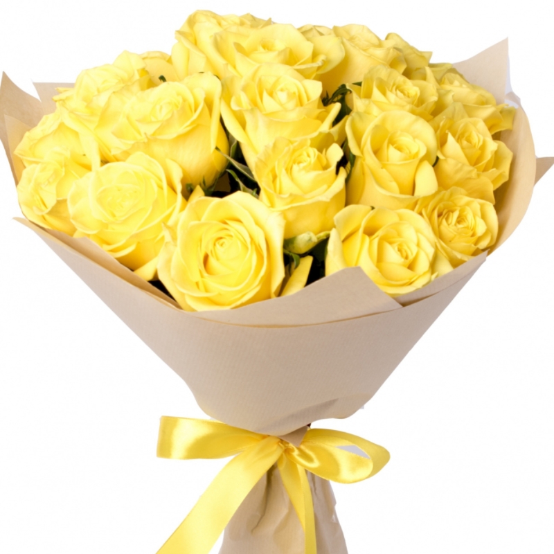 Букет состоит из 21 желтая роза, крафт, желтая лента.