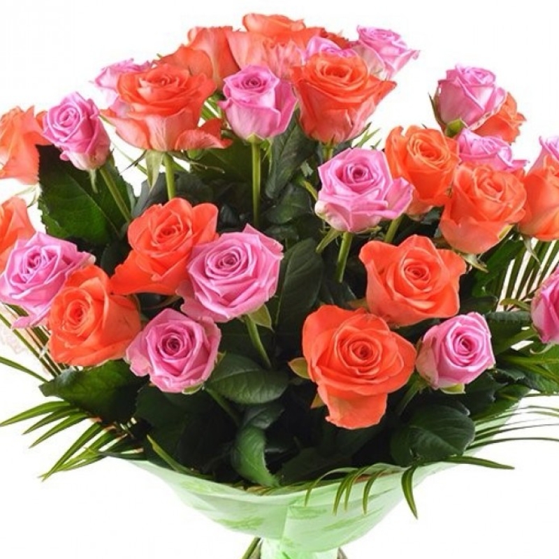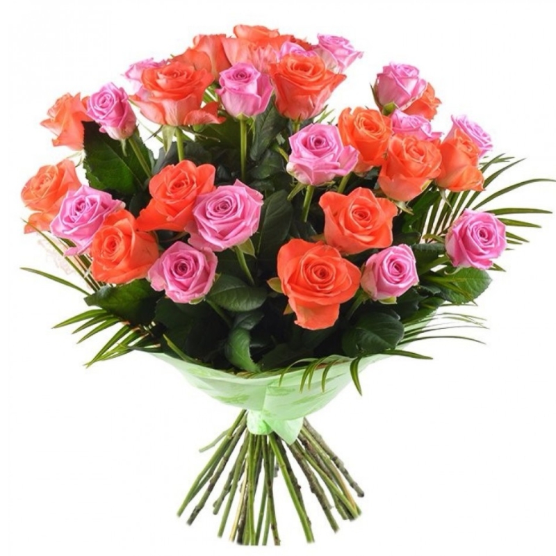 Букет состоит из 16 розовых роз, 15 коралловых роз, зелень, красивая упаковка, атласная лента.