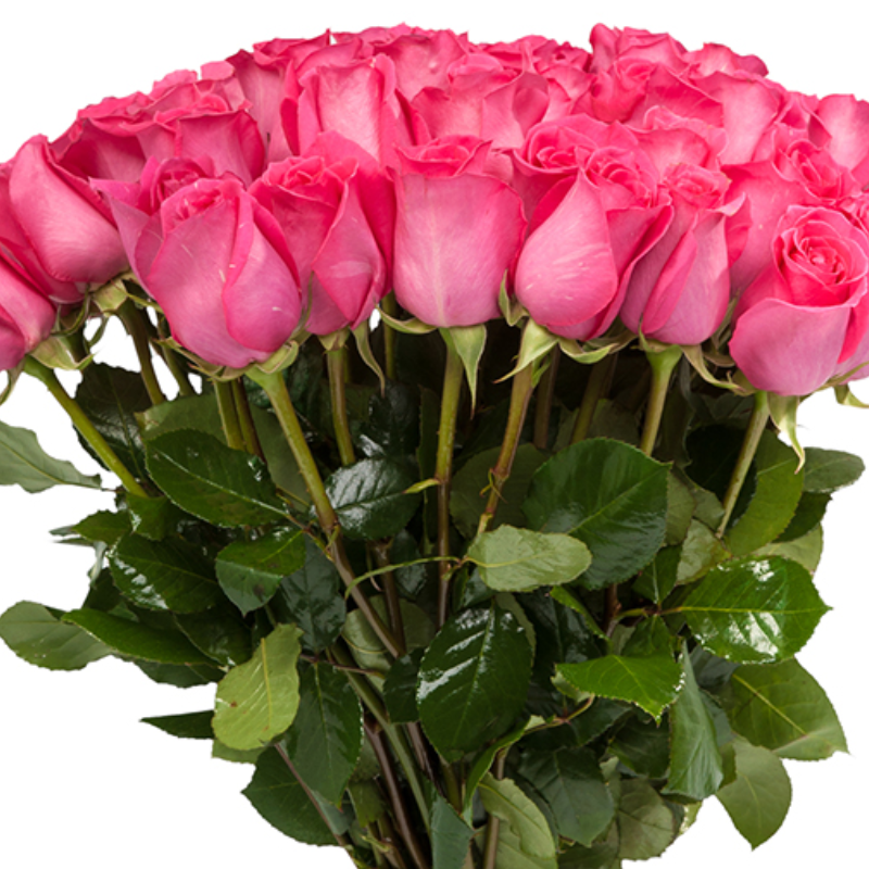 Букет состоит из 45 розовых роз, прозрачная упаковка, атласная лента.